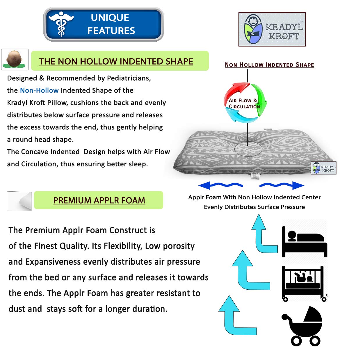 Made with high-density, environment-friendly memory foam to give your baby’s neck and head soft, resilient support. The right pillow should not alter the baby’s natural posture when asleep or awake & a newborn’s brain development relies heavily on blood circulation. Kradyl Kroft's baby pillow is designed to ensure adequate blood circulation to the brain and the other developing organs.