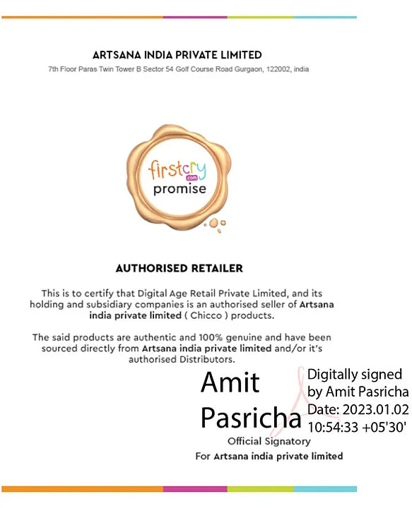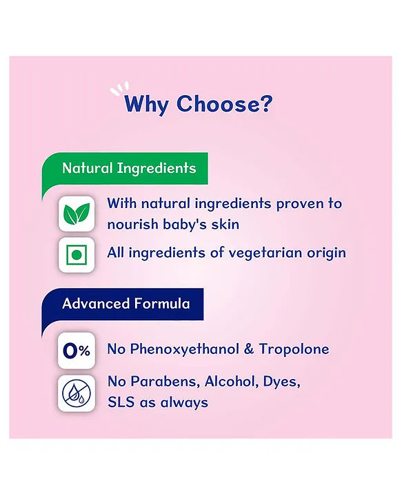 • Free from potentially harmful chemicals: Being a forerunner in bringing latest scientific advancements, Chicco Baby Moments pioneered in offering products free from Phenoxyethanol, Parabens, Alcohol, Dyes, Lauryl Sulphates, Tropolone and with no-added Phthalates, making it suitable for baby's delicate skin.
