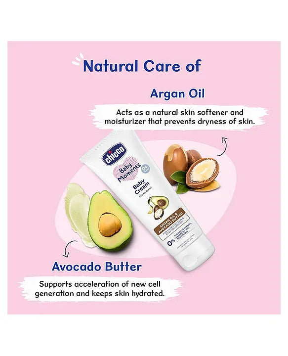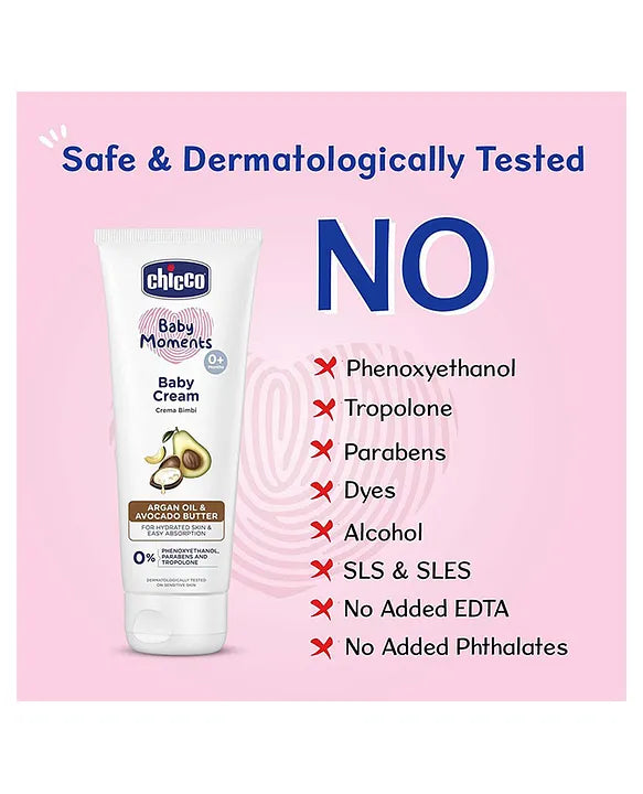 Chicco Baby Moments Baby Cream is specially designed to deeply moisturize and protect your baby's delicate skin. Its light, quick-absorbing formula keeps dry areas like the face, hands, and body soft and smooth all day long. Enriched with natural ingredients, Argan oil acts as a skin softener and moisturizer, preventing dryness and enhancing skin elasticity, while Avocado butter promotes new cell generation and keeps skin hydrated. Free from Phenoxyethanol, Parabens, Alcohol, Dyes, Lauryl Sulphates, and other potentially harmful chemicals, this cream is gentle on sensitive skin. Dermatologically tested, it ensures safe, daily nourishment for your baby's skin.
