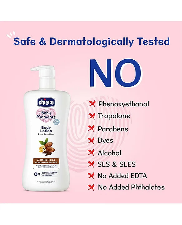 Taking care of the newborn's rich moisturization is an essential care for any new parent. This New Baby Moments Body Lotion has an Advanced formula that does not contain Phenoxyethanol & Parabens. Moreover, it is also free from other harmful toxins & preservatives like Tropolone, Mineral oil, Dyes, Alcohol, Phthalates, and EDTA, which can adversely impact the baby's delicate skin. The new Chicco Body Lotion provides a very rich moisturization from its first usage on baby's skin as it contains the goodness of natural ingredients like Almond Milk, Murumuru Butter, and Almond oil, making it even 'Better' for newborns.