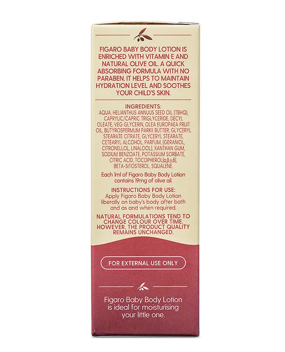 Figaro Baby body lotion is enriched with Vitamin E and natural olive oil. It is a quick-absorbing, paraben-free formula that helps to maintain hydration levels and soothes a baby's skin. Rub the Lotion between your palms and massage the baby gently in large circular motions. Wrap your hands fully on your baby's body while massaging.