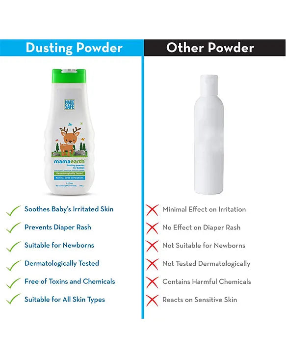 mamaearth's dusting powder is a dermatologically tested 100% natural, no lung-clogging, talc-free body powder. Organic and natural ingredients in it help babies skin retain moisture while treating and preventing diaper rash. Organic Oatmeal in it is a skin protectant. It prevents dry, itchy and irritated skin by maintaining skin's moisture barrier. Natural cornstarch in it helps absorb extra moisture and is antimicrobial. It is safe for your baby as it is dermatologically tested and it contains no harmful chemicals like talc, SLS, paraben, phthalates, or artificial fragrances.