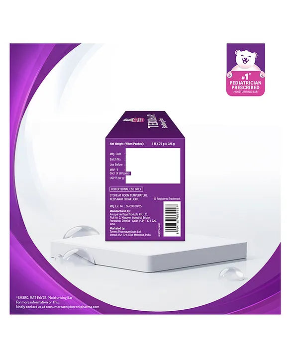 Torrent Pharma Tedibar Moisturising Baby Bathing Bar 75gx3 (Pack of 1) with Skin Friendly pH 100 Percent Soap Free Prevents Dryness & Rashes Dermatologically Tested - By