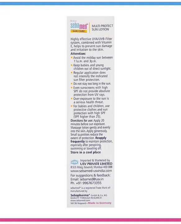 200 ml of Sunscreen Lotion SPF 50 PlusBaby & children skin should not be exposed to direct sunlight, especially under the age of 3. In today's environmental conditions it is extremely important to make sure a child wears a hat and the predominant part of the body is covered with a swimming suit, T-shirt and shorts, when playing at the beach or outdoors.