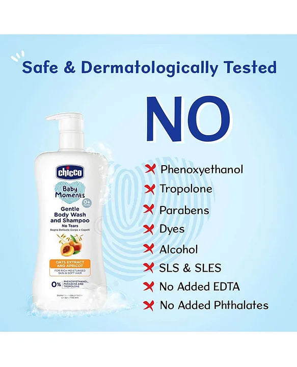 The all new Chicco Baby Moment Gentle Body Wash and Shampoo is 2 in 1 solution for keeping your baby's hair ultra-soft and skin deeply moisturized for daily bathing from its first usage. Made with the goodness of Natural Ingredients that have high proven efficacy in moisturizing baby's skin. Goodness of Oats which contains saponin, which acts as a natural cleanser and is a rich source of hair vitamin which nourishes & smoothens baby's soft hair. Goodness of Apricots that are a good source of water content and keep skin moisturized after bath. Advanced Formula as It's Phenoxyethanol Free: Phenoxyethanol is a commonly used preservative, the excess usage of which is suspected globally to cause skin irritation and allergies on babies' sensitive skin. Also free from harmful chemicals & preservatives like Parabens, Tropolone, Mineral oil, SLS, SLES, Alcohol, Dyes & with no added EDTA & Phthalates. No tears formula that does not irritate baby's eyes. Dermatologically tested on babies' sensitive skin. The new range of Chicco Baby Moments is formulated to meet the strictest standards of safety & efficacy of Chicco Research center, thus meeting the requirements of the new-age parents.