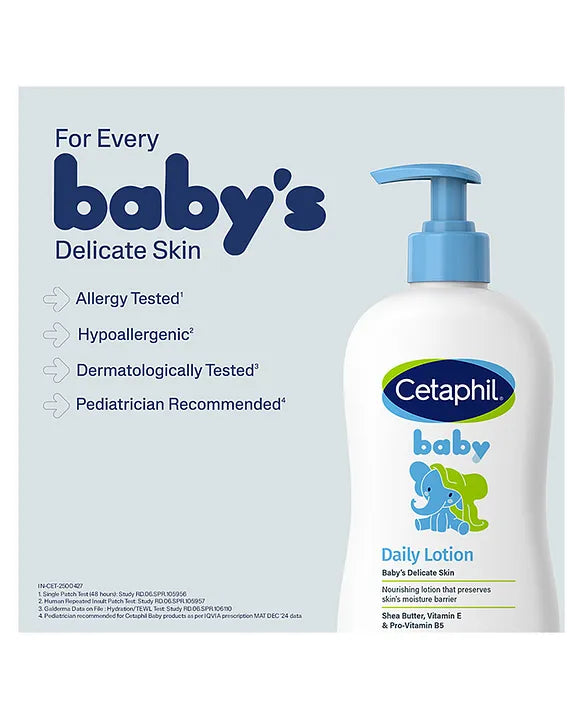 Cetaphil baby daily lotion blends glycerine and shea butter to moisturise and protect your baby's delicate skin. This mineral oil free and hypoallergenic formula hydrates, softens and nourishes.