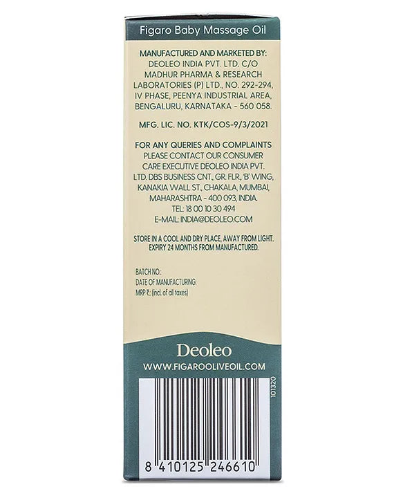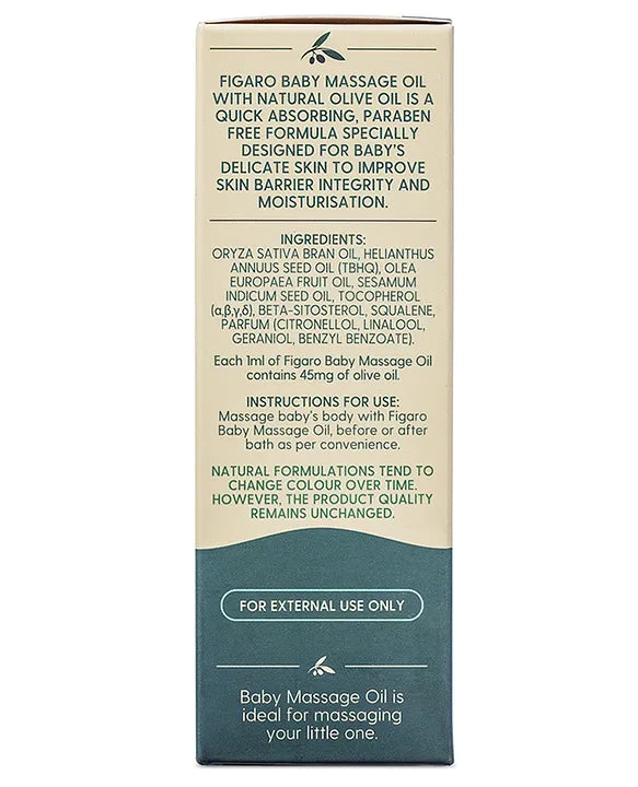 Figaro Baby massage oil, with natural olive oil, is a quick-absorbing, paraben-free formula, specially designed to improve a baby's delicate skin barrier integrity and moisturization. Rub the oil between your palms and massage the baby gently in large circular motions. Wrap your hands fully on your baby's body while massaging