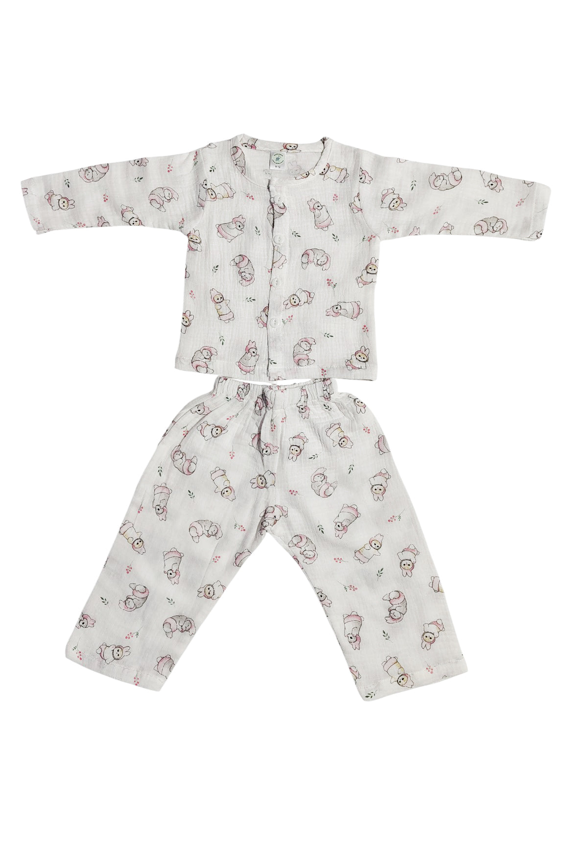 Designed for delicate newborn skin, this cute printed Kradyl Kroft night suit set features 100% organic double-layered muslin that offers superior softness and durability. The thoughtfully engineered diaper-cut pants accommodate growing babies comfortably, while the full front button closure enables quick, hassle-free dressing during nighttime changes. Featuring vibrant prints and a stretchy elastic band for a secure fit, this machine-washable set suits infants from newborn through 36 months. The sturdy yet gentle fabric construction ensures reliable comfort night after night, making it an essential addition to your baby's sleepwear collection.